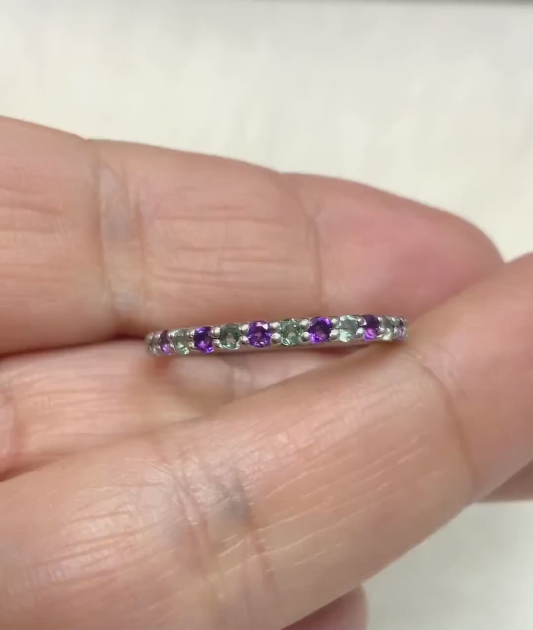 Amethyst Alexandrite Ring/ 2mm Half Eternity Alternating Alexandrite Amethyst Wedding Band/ Shared Prong February June Birthstone Ring.