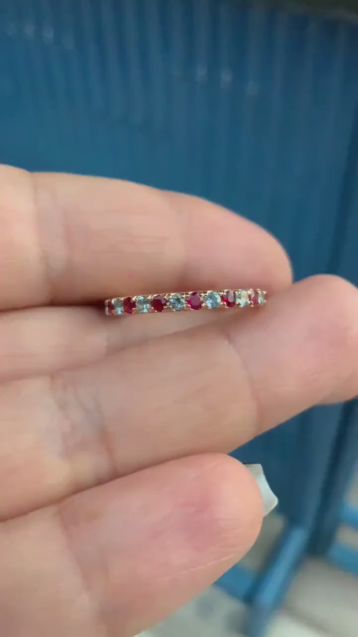 Aquamarine Ruby Band/ Pave 2.3mm Alternating Ruby Aquamarine Full Eternity Wedding Band/ March July 2 Birthstone Maternity Stacking Ring.