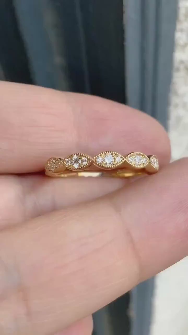 Diamond Milgrain Marquise Ring/ 3mm Half Eternity Wedding Band/ Marquise Shapes w 3 Natural Diamonds/ Unique Diamond Stacking/ Gold Platinum.