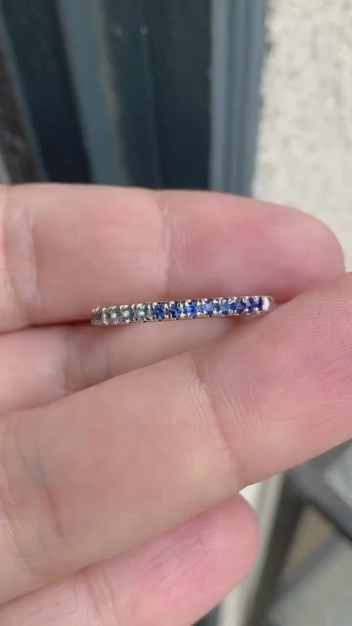 Gradient Blue Green Pave Ring/ Coastal Ombre Beach Wedding Band/ 2mm Half Eternity/ Mermaid Colors Diamond Alexandrite Aquamarine Sapphire.