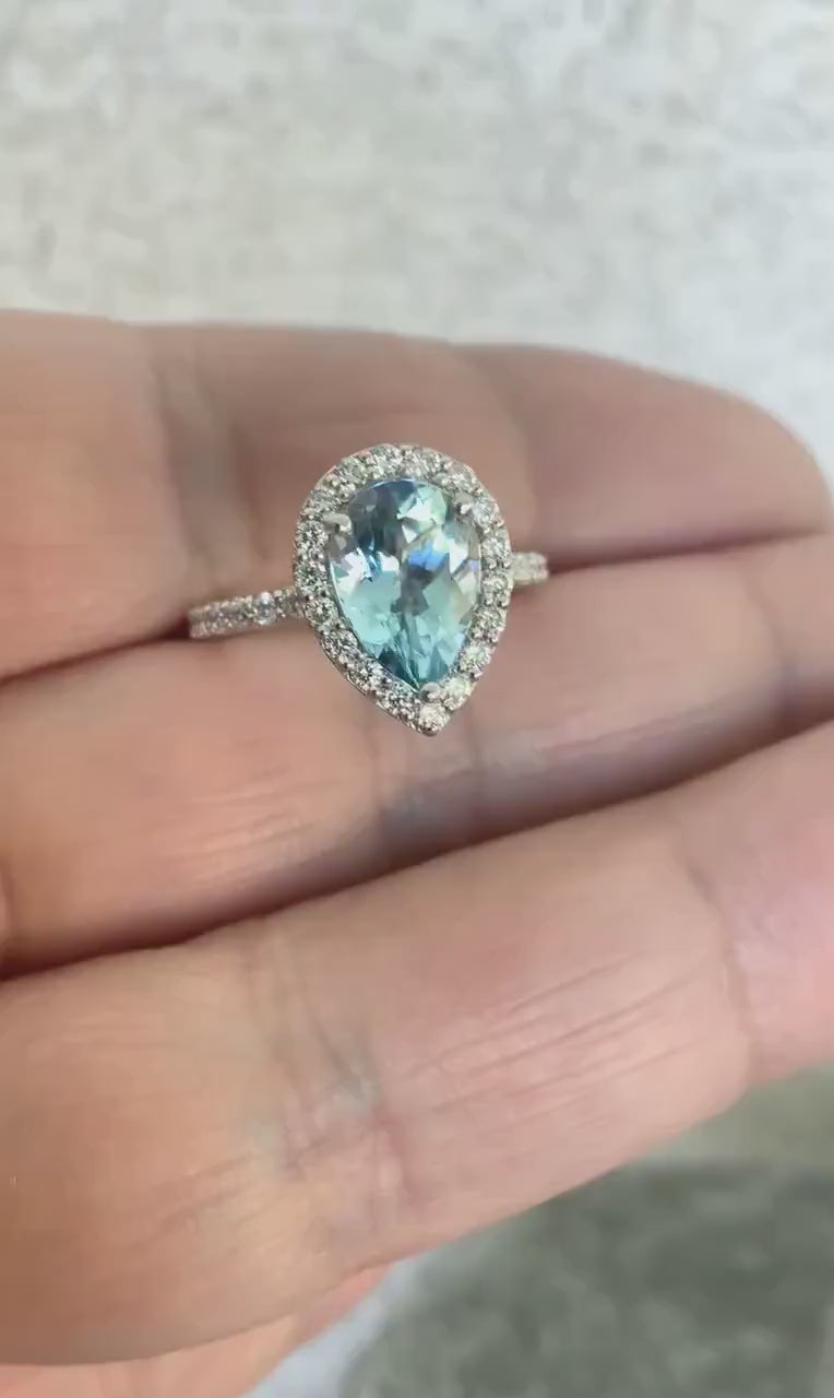Pear Shape Aquamarine Engagement Ring with Diamond Halo - 1.6 Carat (14K/18K Gold or Platinum).