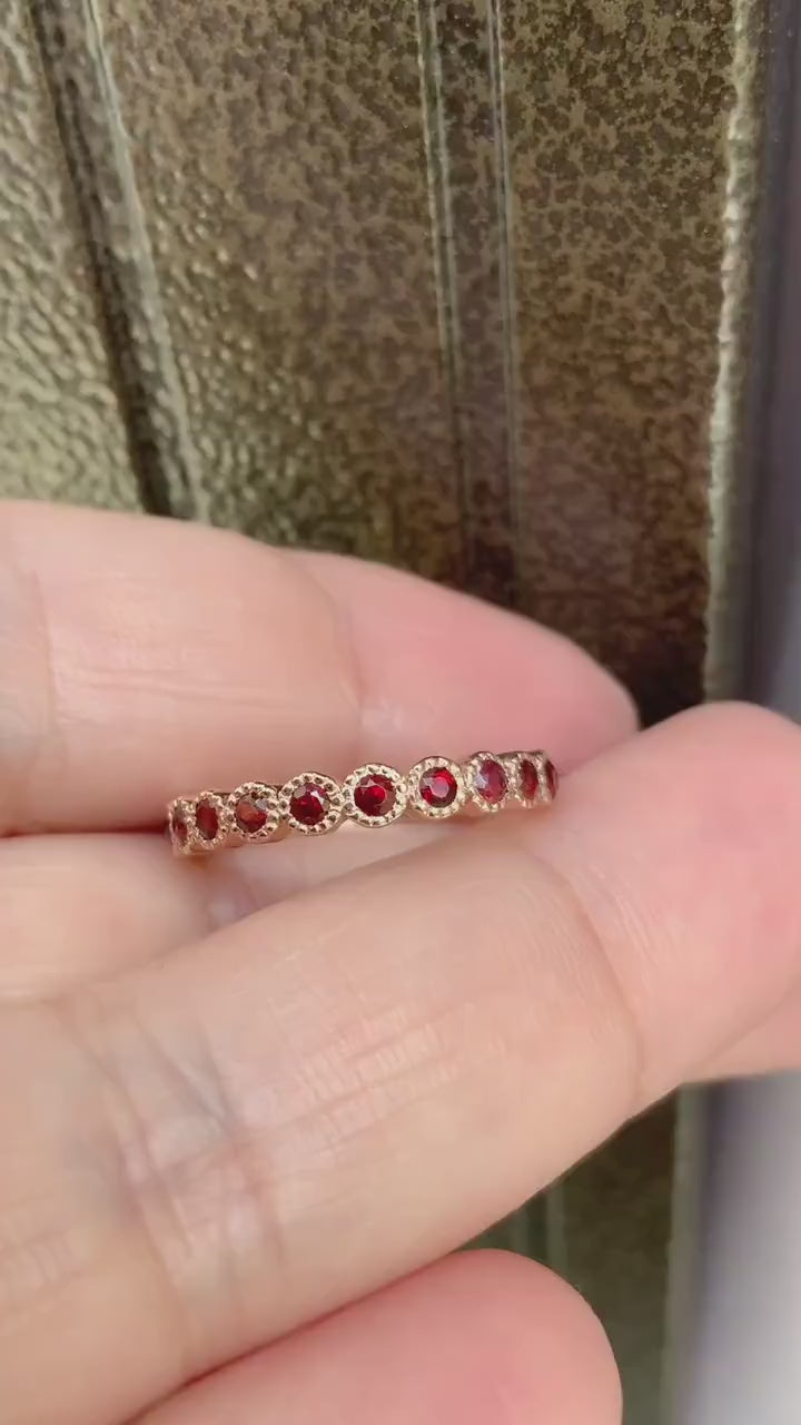Solid Gold Garnet Stacking Ring - 3mm Milgrain Bezel Half Eternity Band (January Birthstone).