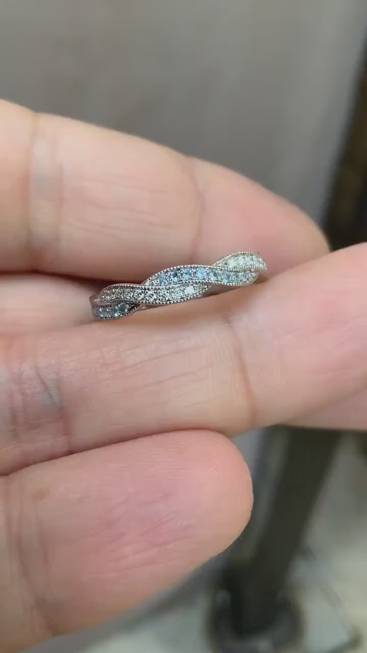 Twisted Diamond Aquamarine Ring/ 3.6mm Milgrain Pave Full Eternity Twist Ring/ Diamond Aquamarine Intertwined Wedding Band/ Gold or Platinum.